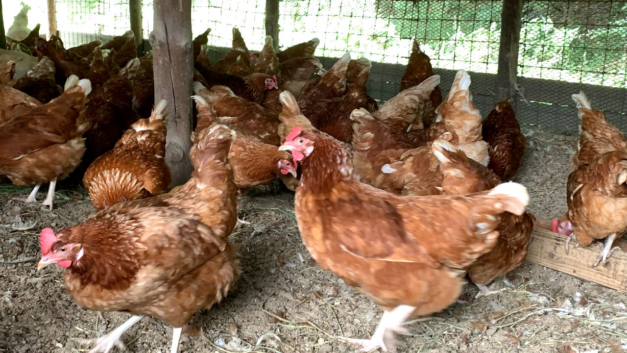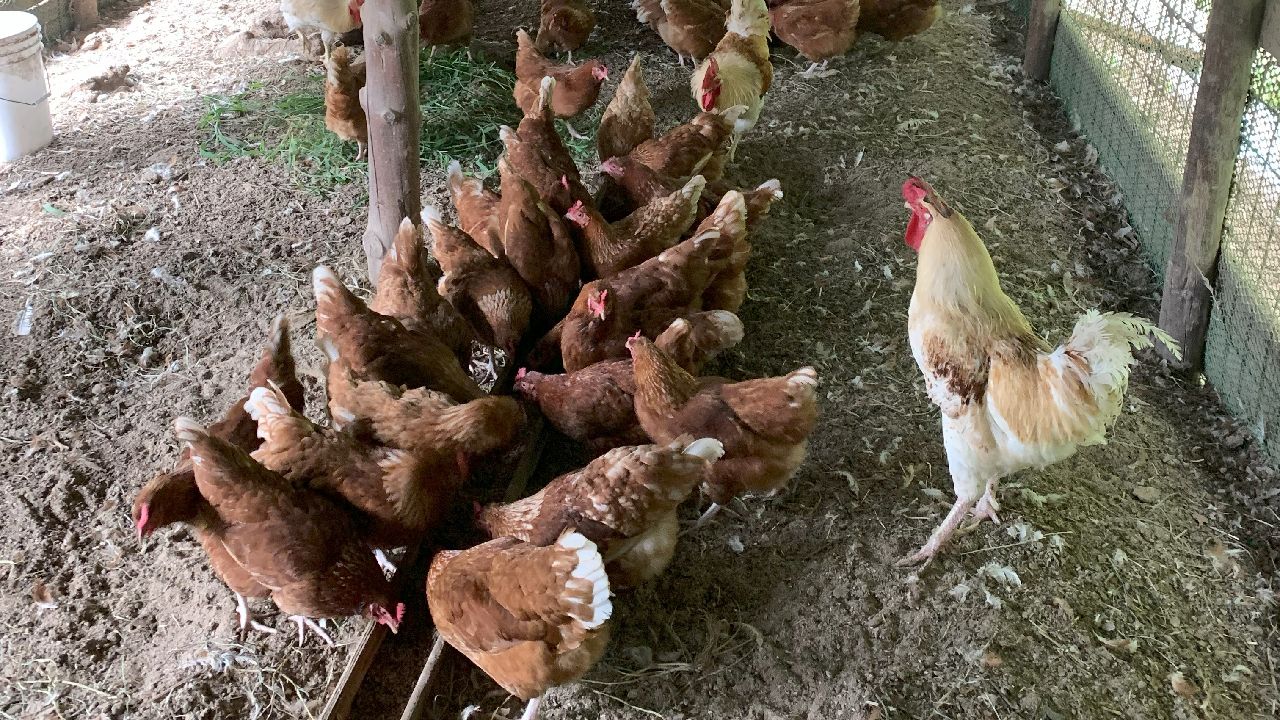 鶏舎の中で様子。美味しそうに餌を食べています。平飼いなので、鶏舎の中では鶏が自由に動き回っています。